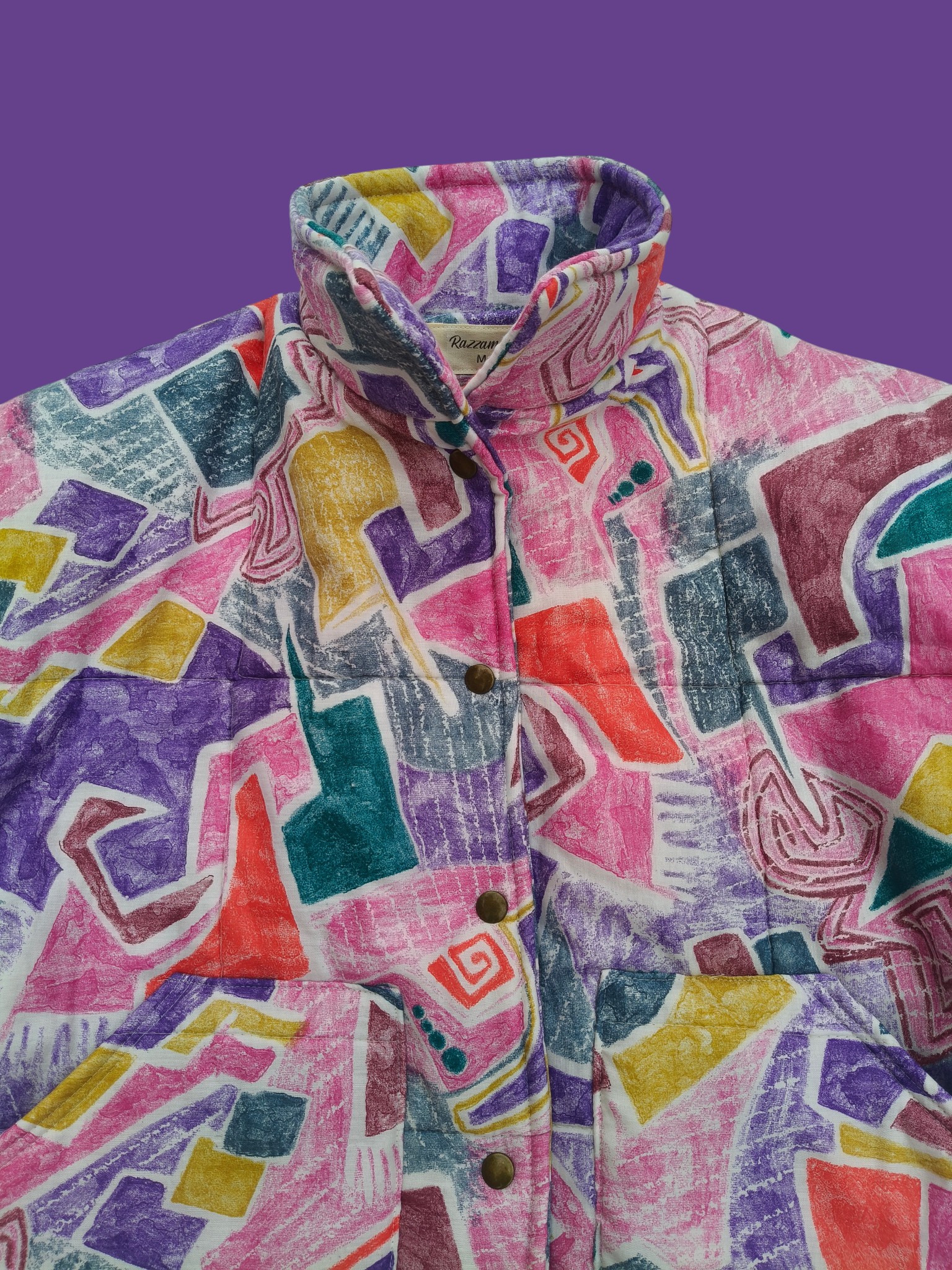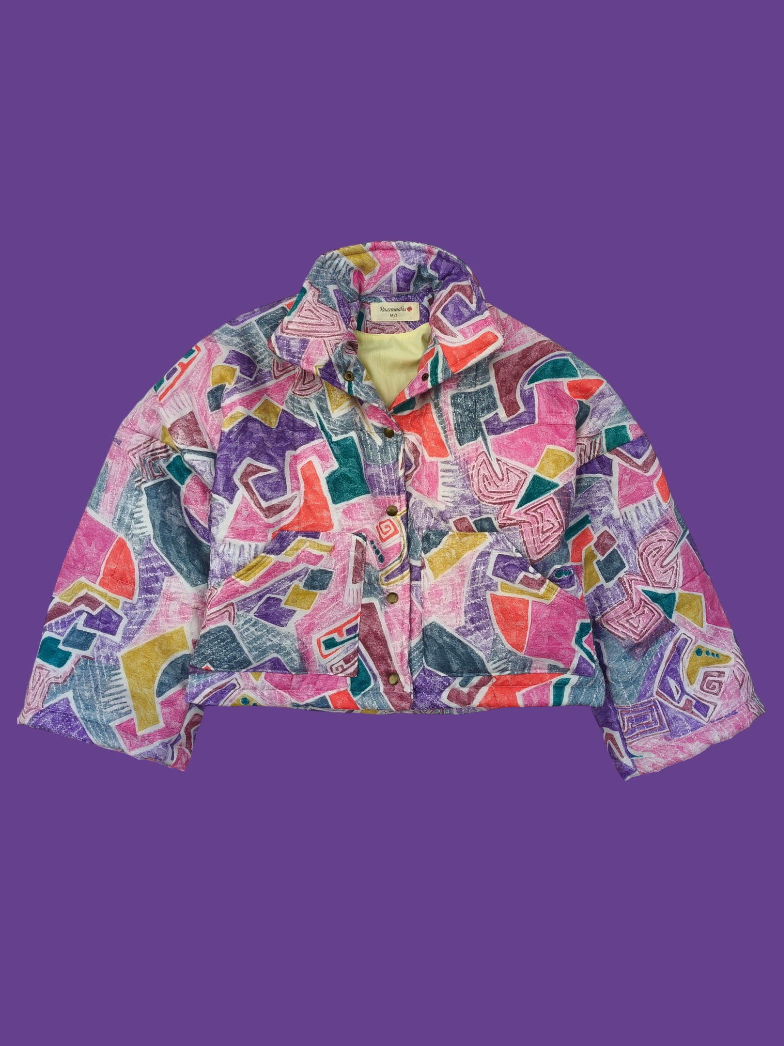 Chaqueta hecha a mano mediante upcycling, transformando una colcha vintage en una prenda única y sostenible. Completamente forrada, acolchado grueso.