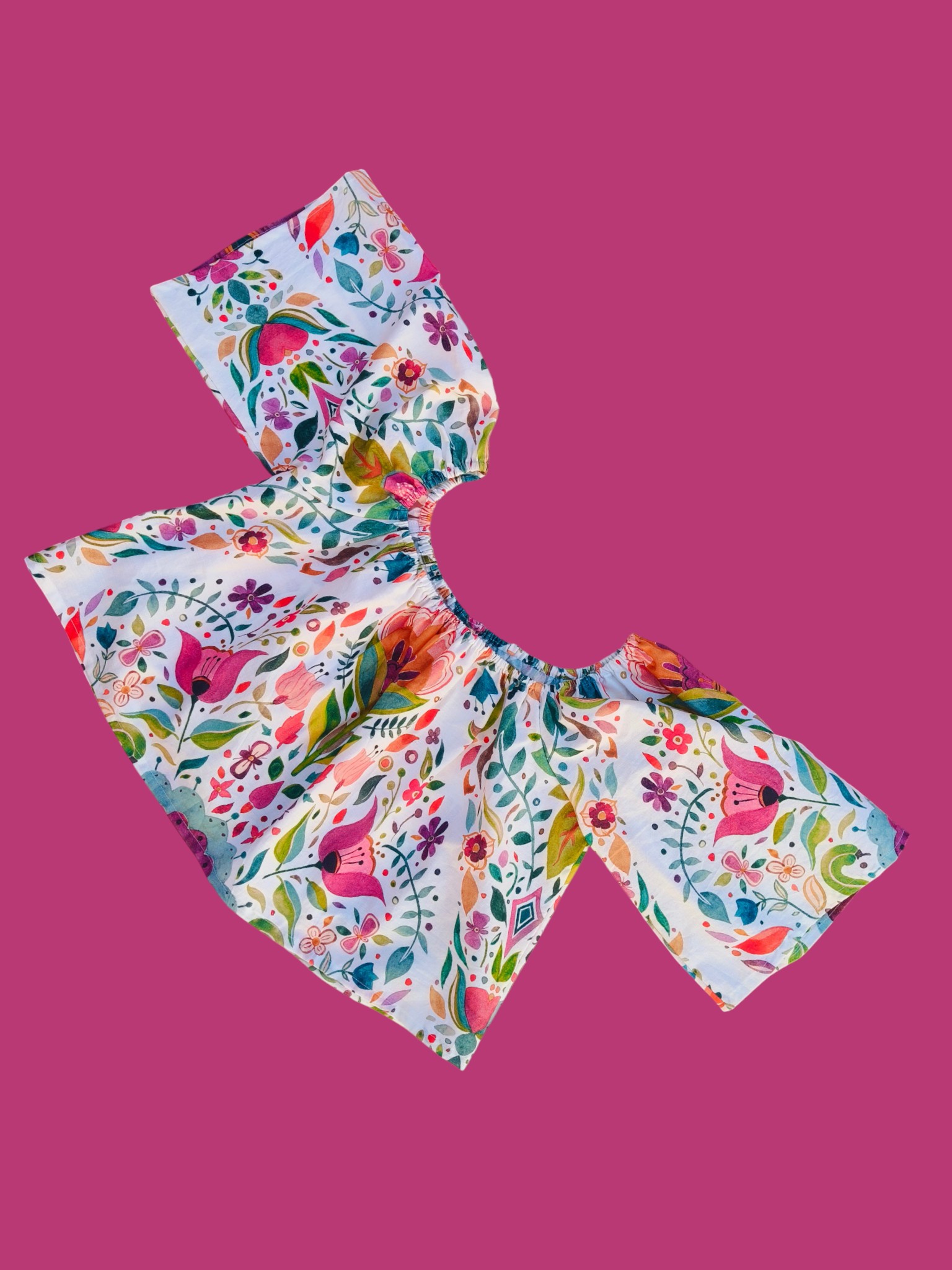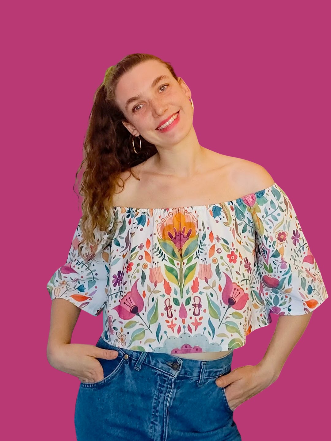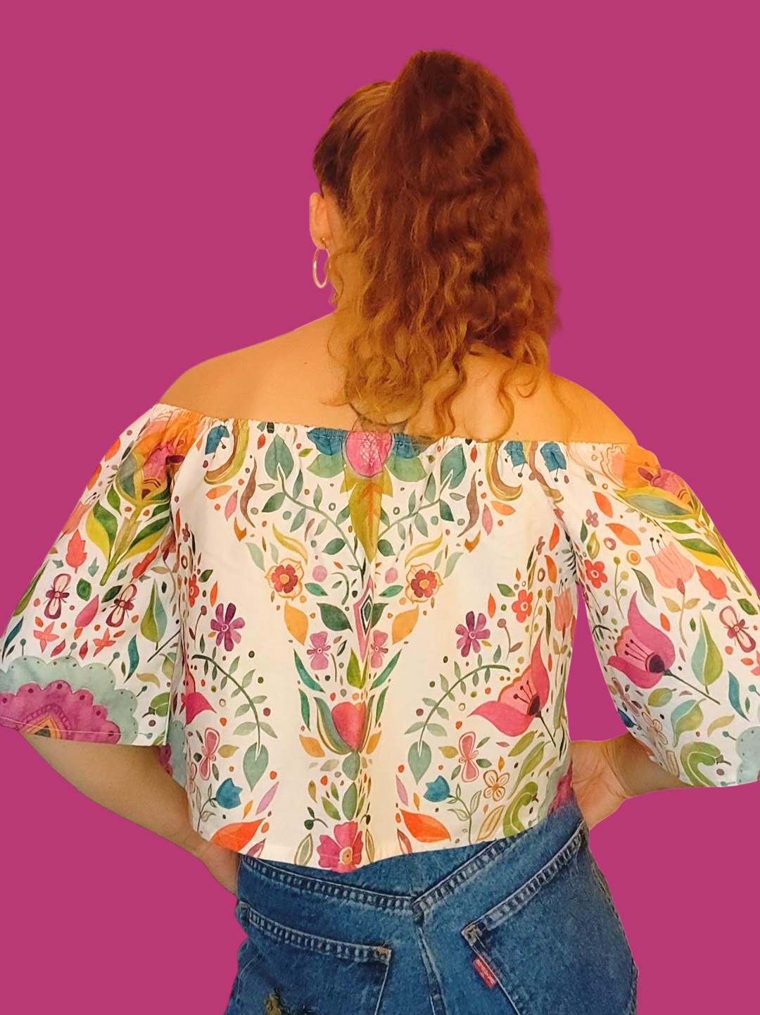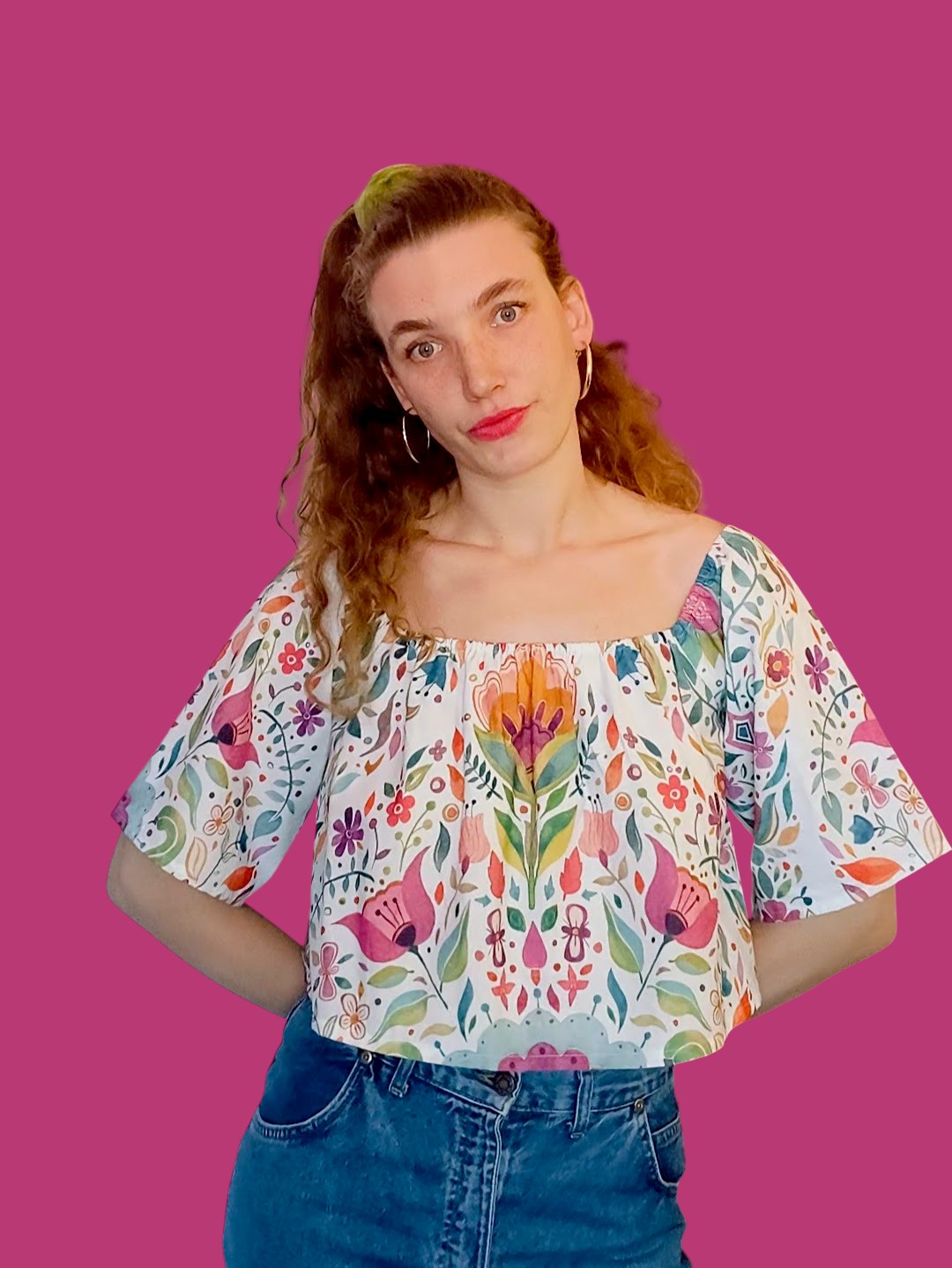 Top amplio y fresquito, confeccionado a partir de un retal recuperado 100 % algodón. Su diseño versátil con elástico en el escote permite llevarlo cubriendo los hombros o con los hombros al descubierto, según lo que te apetezca.